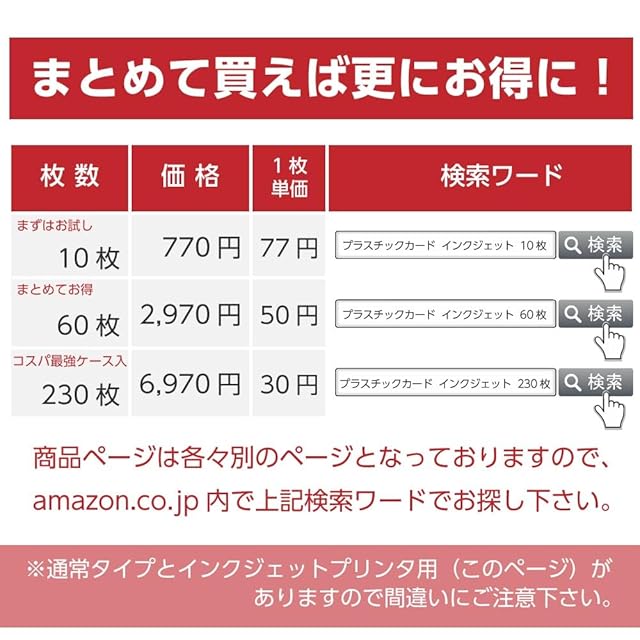 10枚入、60枚入、230枚入の3ラインアップをご用意しております。※ご注文のタイミング、製造ロット等によってカードのホワイトの色味が異なる場合がございます。予めご了承ください。