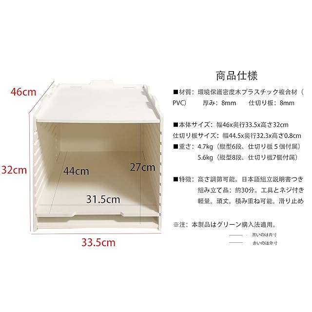■本体サイズ(外寸):幅46x奥行33.5x高さ32cm(横型) 仕切り板のサイズ:幅45x奥行31.5x高さ0.8cm 幅33x奥行46x高さ32cm(縦型) 仕切り板のサイズ:幅44.5x奥行32.5x高さ0.8cm 本体重さ:約3.9kg 耐荷重:仕切り板1段約5kg、天板約6kg。
