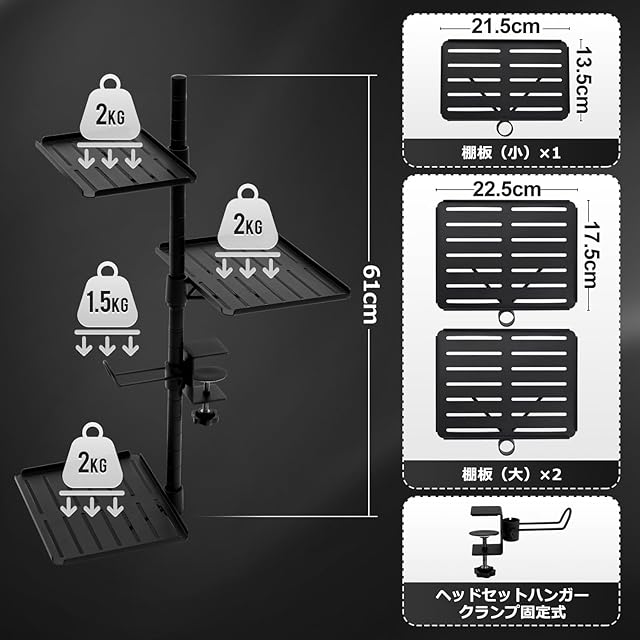 【収納パーツ】KOTESOTOの机上ラック クランプは棚板(大)×2、棚板(小)×1、C型ヘッドヘッドホンクリップ×1の計4点が含まれています。棚板(大)の内寸は22.5CM*17.5CMで耐荷重2KG、棚板(小)の内寸は21.5CM*13.5CMで耐荷重2KG。