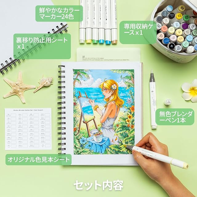 「収納ケース付き」セット内容:イラストマーカーペン36本、無色のブレンダーペン1本、専用収納ケースx1、カラー見本シートx1、裏移り防止シートx1、マニュアルx1。※ご注意:キャップ内部と外部の異なる空気圧はインク漏れの原因となります。使う時は丁寧にキャップを外しください。