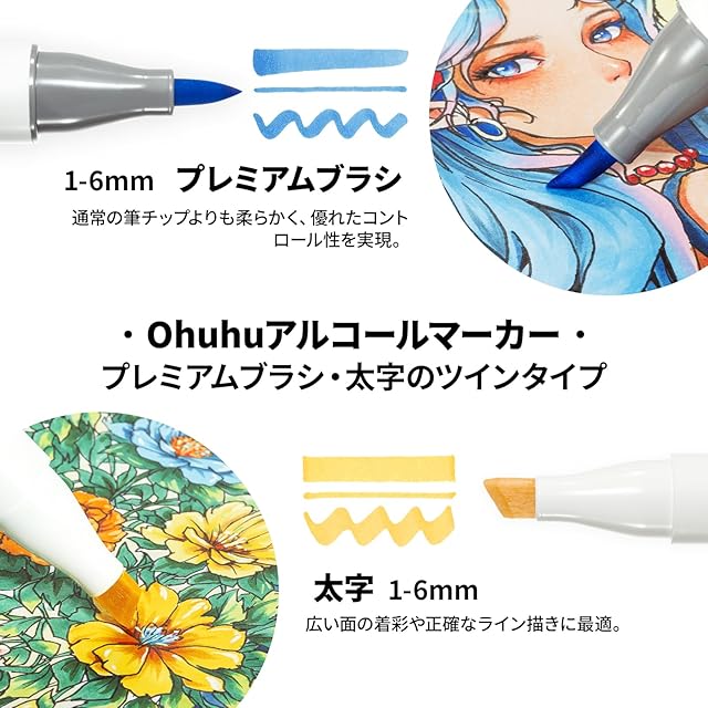 Ohuhu イラストマーカー プレミアムブラシ・太字 36基本色 プロ向け 筆タイプ マーカーペン セット アルコール系 ブレンダーペン1本付き Honolulu Plusシリーズ