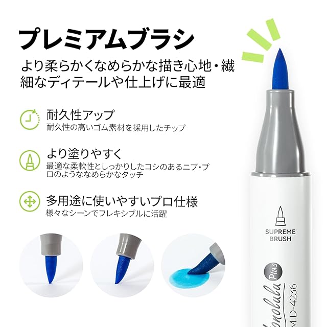 「Honolulu Plusシリーズの特徴」プレミアムブラシ・太字のツインタイプマーカー。耐久性の高いゴム素材を採用したプレミアムブラシチップは通常の繊維制の筆チップよりもっと柔らかく、塗りやすくて、プロのようななめらかなタッチを実現。太字チップは広い面の着彩や正確なライン描きに最適。ボディは円筒形で握りやすい仕様。キャップに色番号と色名が印字されており、ほしい色すぐに見つけることができます。