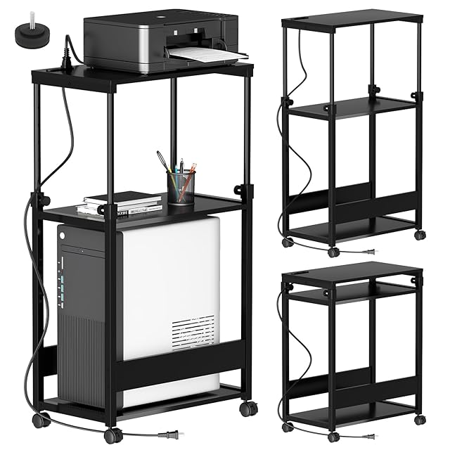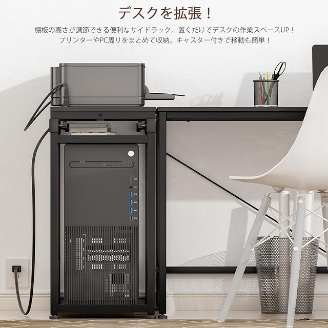 【使用シーン】オフィスデスクの横でのPC周辺機器収納、在宅ワーク時のCPUラックとして、ゲームルームの機材スタンド、リビングの植物棚、寝室のコンパクト本棚など、あらゆる作業スペースにフィット。コンセント付きで、プリント台やキッチンラックとしても使えます。スチールフレームと調整可能な棚板で、デスク周りの「足りない収納」をサポートします。