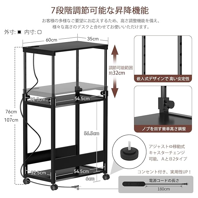 LunarLight デスクサイドワゴン 幅60奥行35高さ75~107cm 昇降式 コンセント付き PCパソコンCPUワゴン サイドテーブル 収納 コンセント付き ストッパキャスター移動式とアジャスター固定式2機能 棚 プリント台 オフィス 在宅ワーク 組立簡単 移動便利 工具不要 耐震転倒防止 (ブラック)
