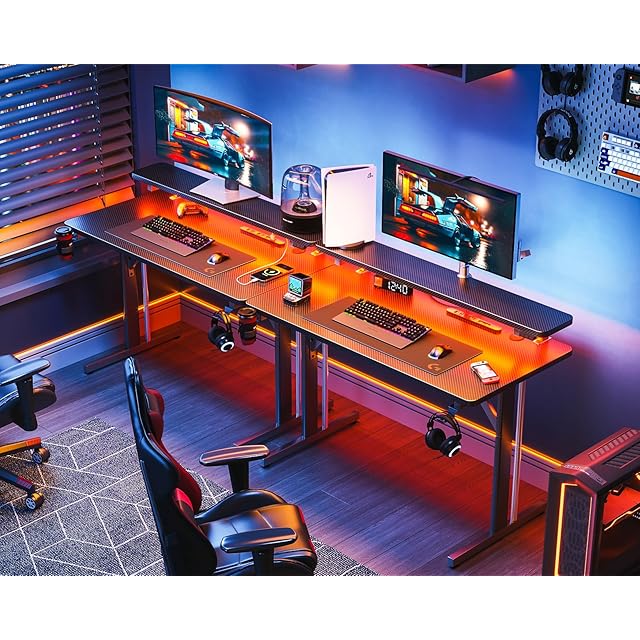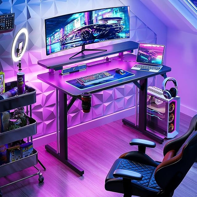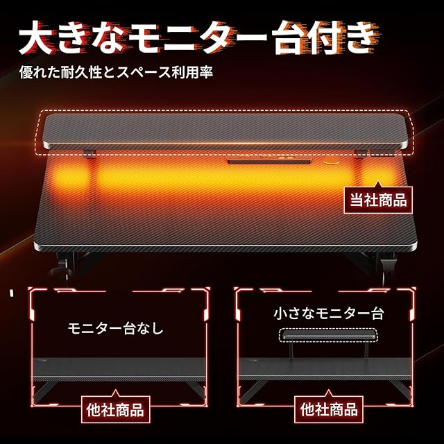 MOTPK ゲーミングデスク LEDライト付き ゲーミングテーブル PCデスク 炭素繊維天板 モニター台付き パソコンデスク フック付き コンセント付き ゲーミング机 ゲームデスク 幅80cm*奥行50cm*高さ75cm ブラック