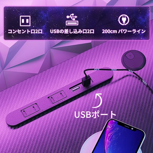 【LEDライト付きのゲーミングデスク】搭載されたRGB変色LEDライトは8種のモードと8つのカラーを設定できるため、ゲームセ雰囲気をより高められます。滑らかな手触りのカーボンファイバー製テーブルトップと相まって、ゲーム体験を大いに盛り上げてくれます。