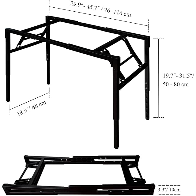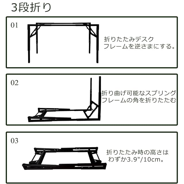 【折りたたみ式デザイン】: デスクフレームは折りたたみ式で、収納や持ち運びが簡単です。使用しないときは、デスクの脚とデスクトップを一緒に折りたたんで、自宅やオフィスのスペースを節約できます。デスクフレームの全体サイズは47.2インチ x 23.6インチ x 29.5インチで、狭いスペースに適しています。
