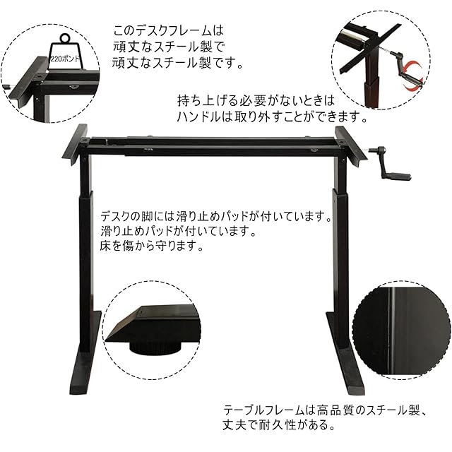 【頑丈な構造】: このデスクフレームは高品質のスチール製で、強力な支持力があります。厚手のスチールプレートと三角形の構造により、デスクの安定性と耐久性が確保されています。デスクの脚には滑り止めパッドが装備されており、滑りを防ぎ、床を傷から守ります。