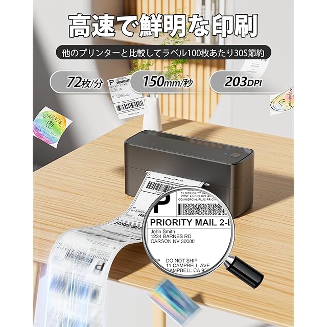 【高速で鮮明】解像度203dpiの感熱ラベルプリンターは、高速かつ鮮明な配送ラベルを提供します。1分間に約72枚のラベルを効率的に印刷できます。また、幅の範囲も広く、25mmから126mmまでの幅のラベルに対応しています。このような特徴を持つ感熱ラベルライターは、物流業務や倉庫管理など、迅速かつ正確なラベル印刷が求められる場面で重宝されます。