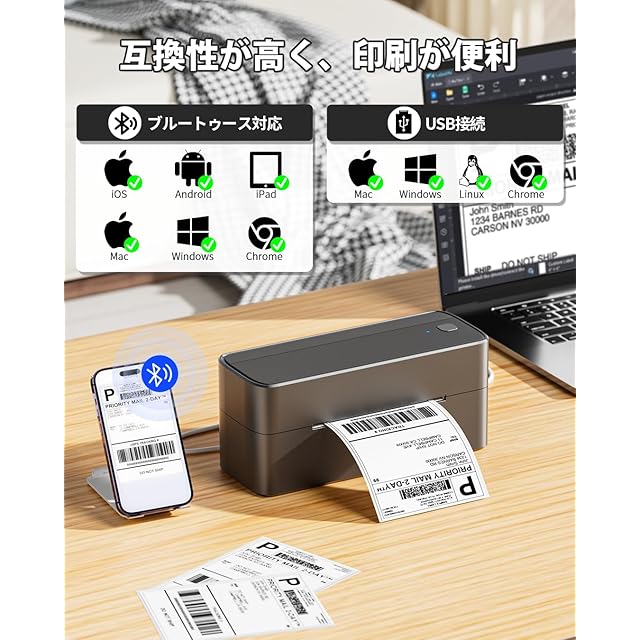 【2つ目の使い法】:PCとのUSB接続で印刷:このラベルライターは、Windows XP/7/8/10/11、ARM CPU搭載のWindows Surface、Mac 10.6以上、Chrome OS、Linux(Raspberry Pi、Centos 7.0、Ubuntu 12.04以上)に対応しています。 使用するには、「241BTドライバー」と「Labelife」ソフトウェアをダウンロードする必要があり、Chrome OSはLabelifeプラグインが必要です。