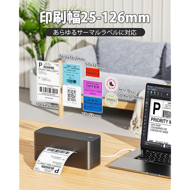 【幅広い用途でご利用できる感熱式出荷プリンタ】印字幅25〜126mmに対応し、ユーザーフレンドリーな「Labelife」ソフトウェアは、登録不要でご利用でき、業務注文や出荷ラベル、小型ラベルなど、丸型、長方形、ホログラフィック、カラー、星型、ゴールドラベルなど様々なスタイルの印刷が簡単に行えます。また、価格表示、バーコードやQRコードラベル、食品成分表示、キッチンスパイスのラベル、小さなボトルや容器への印刷にも適しています。