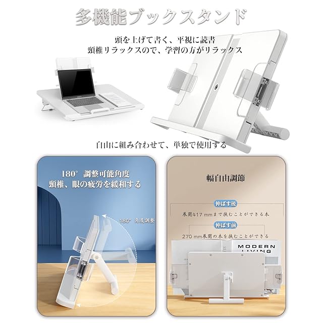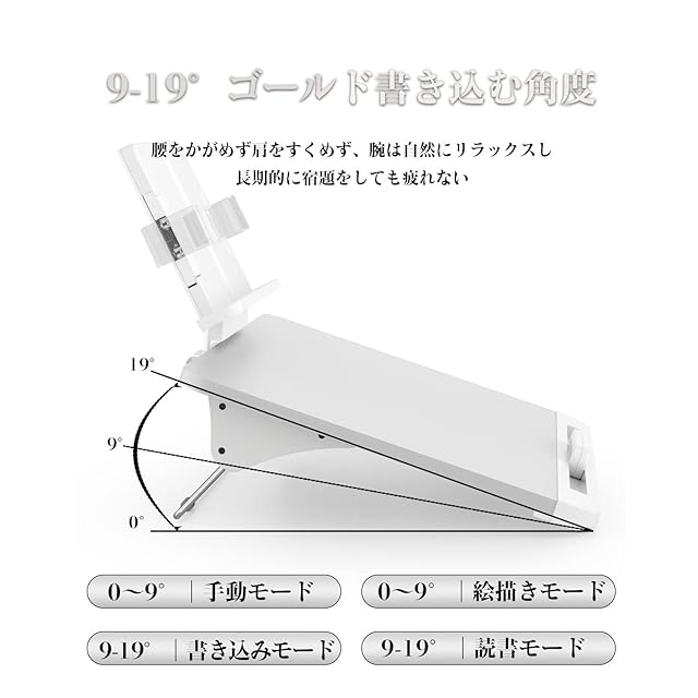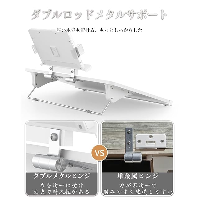 【高さ調整可 角度調整可】書見台はさまざまのお客さまによって、上部ブラケットは無料でスタンドが付いているので、単独で使うことができます。180°無限に調整可能です。下部ブラケットは10~9°|手動モード・絵描きモードと9-19°|書き込みモード・読書モードです。本を視界に合った高さに置くことができます。首、肩、腰への負担を軽減します。