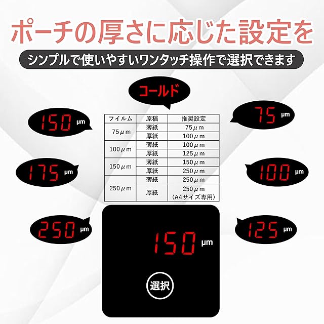 【LEDディスプレイタッチパネル】ポーチの厚さに応じた設定を、シンプルで使いやすいワンタッチ操作で選択できます。ラミネートフィルムや用紙の厚さに応じた推奨設定が、機械本体に印刷されていますので、家庭、学校、オフィスでの使用に最適です。