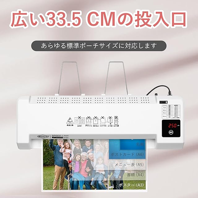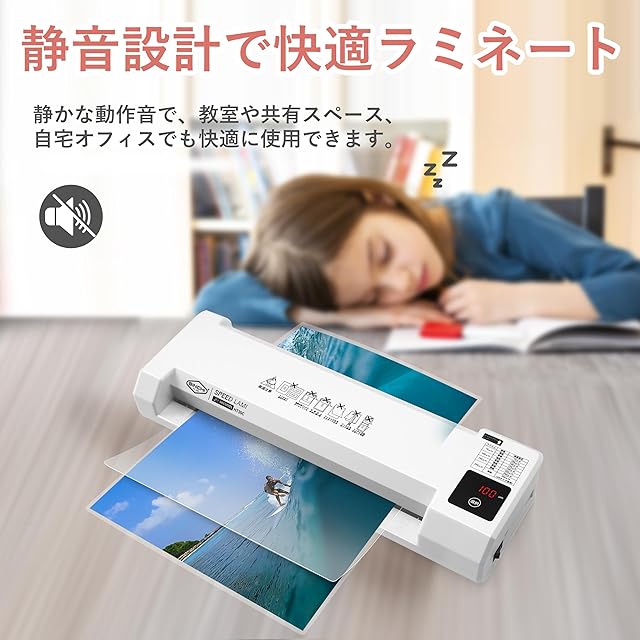 【製品ポジショニング】本製品は、ラミネートのニーズがあるユーザーが、手頃な価格で多機能なラミネーターを手に入れられるように設計された、日常使いに適した実用的な中級〜高級モデルです。さまざまな厚み・サイズのラミネートフィルム(特に250μm以下)に柔軟に対応できます。 ※250μmフィルムと濃い色の厚紙の組み合わせでのラミネートには対応に制限があり、最大A4サイズ・1回あたり5〜10枚程度の少量かつ時々の使用に適しています。 ※業務用途や大量処理には対応しておりません。