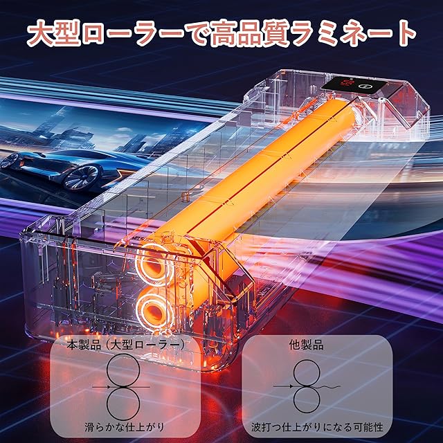 【大型2本ローラーで高品質ラミネート】一般的な2本ローラー機より約50%大きなローラーを採用し、より滑らかで美しい仕上がりを実現します。