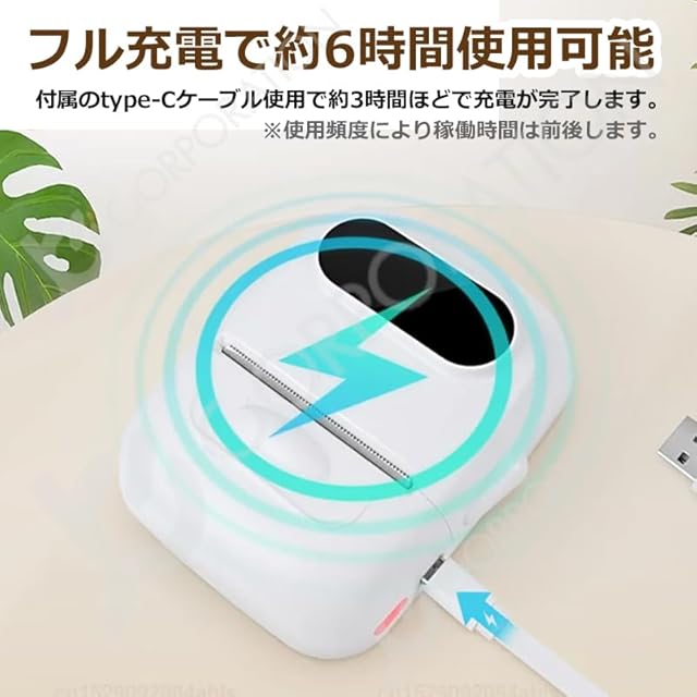 【充電式でコンパクト】充電式で電池を用意する必要なし。大容量バッテリー搭載で、フル充電後(約3時間)、連続6時間の使用ができます。手のひらサイズ、約200gととってもコンパクト。どこでも持ち運び可能です。