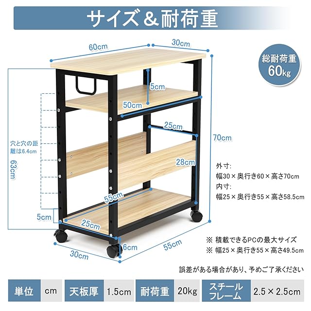 【サイズ】➤完成品サイズ:幅60×奥行き30×高さ70cm(キャスターを付けた状態) ➤積載できるPCの最大サイズ:幅25×奥行き55×高さ49.5cm(中棚を取り外す場合)です。