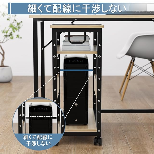 【キャスター、取っ手、落下防止バー付き】➤四つの足に360°回転のキャスターが付いて、掃除やメンテナンスに便利です。前2つのキャスターにはストッパーが付いて、デスクが滑るのを防ぎ、動かさない時も気にせずお使いいただけます。➤デスクワゴンの側面は取っ手付いて、片手で本体を引き出すことができて、PC本体の配線をメンテナンスするときに便利です。➤ワゴンの後ろに搭載したバーがPCの落下を防ぎます。PC本体を移動する時にも安心できます。
