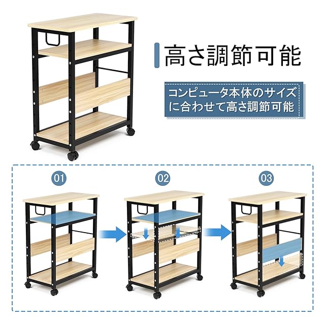 【中棚やサイドパネルの高さは6段階調整可能】➤パソコンワゴンの中棚が6段階に調節できて、収納するパソコンによって適当な高さを調整できて使いやすいです。 ➤付属した2枚のサイドパネルの取り付け位置が自由で調整可能となります。ご利用によりワゴンの両側、もしくは同じ側に取り付けます。ご必要のない場合、外すこともできます。