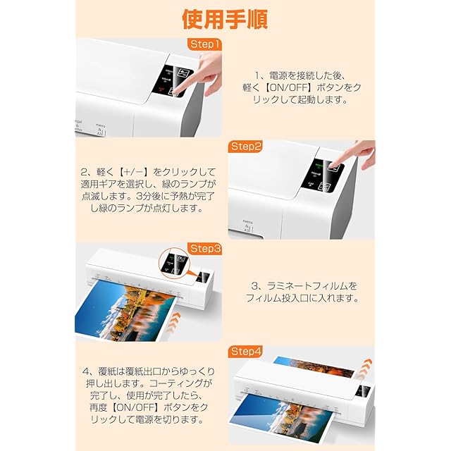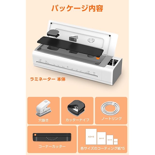 【パッケージ内容】ラミネーター本体 ×1、カッター ×1、パンチ ×1、角丸カッター ×1、手帳リング ×3、各サイズのラミネートフィルム ×5、日本語取扱説明書 ×1【ご注意】付属のラミネートフィルムの厚さは80μmです。本機は80μm〜150μmのフィルムに対応しておりますので、ご使用の際は厚さに合ったフィルムをお選びください。【お問い合わせ方法】「注文履歴」から該当の注文を選択し、商品ページへ移動後、「販売元」の「質問する」ボタンよりお問い合わせください。お問い合わせには24時間以内にご返信いたします。