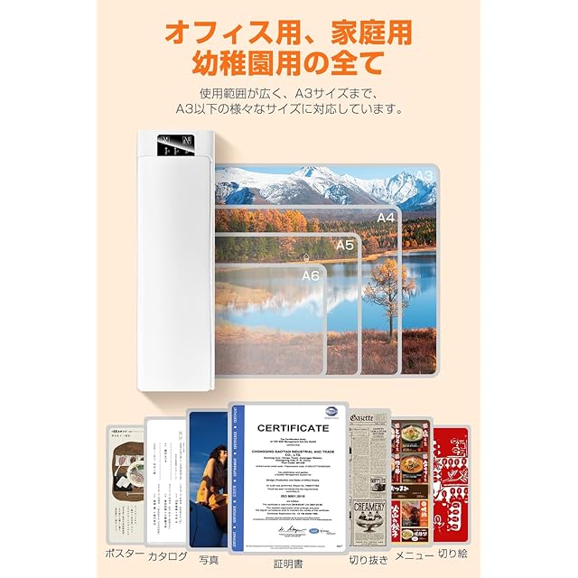 【最大A3サイズ対応・家庭用にもオフィス用にも最適】本ラミネーターはコンパクトで場所を取らず、使いやすさが特長です。最大でA3サイズの用紙まで対応しており、A3やA4のメニュー、ポスター、証明書、書類はもちろん、A5サイズのPOP、写真サービスサイズ、名刺、身分証、会員カード、写真、イラスト、はがきなどの小さな用紙もラミネート可能です。ご家庭でもオフィスでも、思い出の写真や大切な書類を簡単に保存できます。