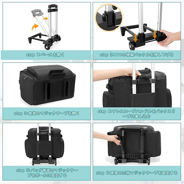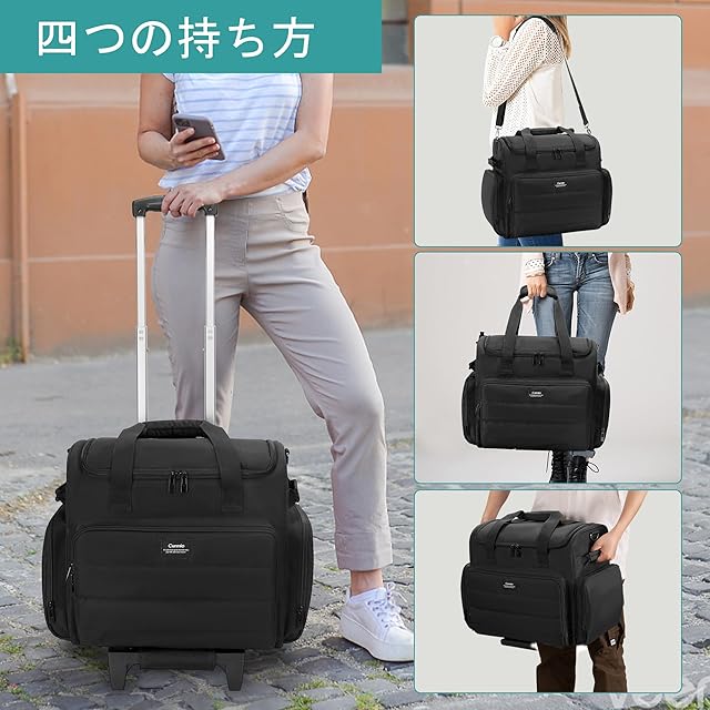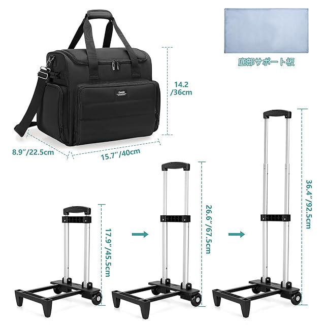 持ち方多い:調整可能なショルダーストラップ、頑丈なトップハンドルと二つのサイド持ち手、取り外せる台車の四つの持ち方で、持ち運びが便利です。折り畳み式台車のアルミポールの高さは45.5cm-92.5cmです。