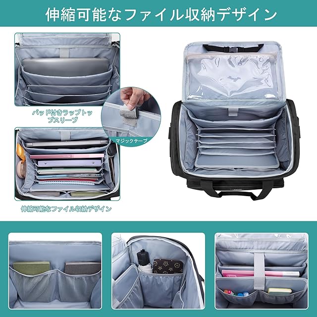 収納力抜群:大容量なCURMIO 訪問看護バッグ、そのメイン室には伸縮可能なアコーディオン式ファイルバインダーがあり、書類などを六つの分類収納ポケットに保存できます。医療用品もまとめて収納できます。内部に設置されたサイドポケット二つはお薬や聴診器などの医療グッズを収納できます。パッド付きのパソコン専用ポケットは15.6インチのラップトップに対応できます。