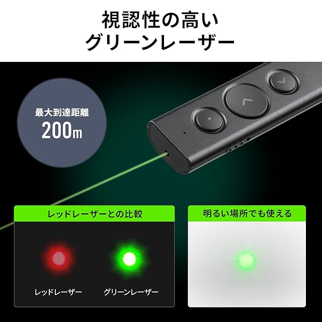 サンワダイレクト レーザーポインター 緑 USB 充電式 パワーポイント操作 スライド ページ送り プレゼンター クラス2 グレー 200-LPP049GY