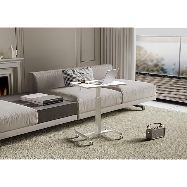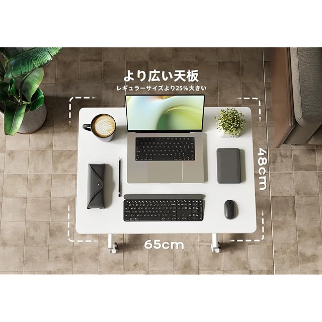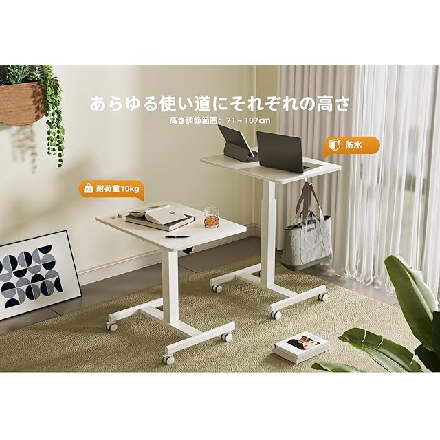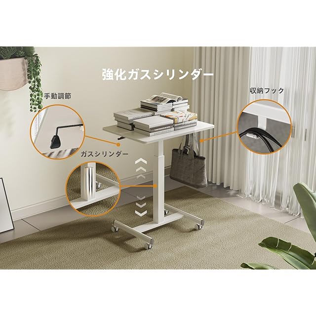 【組立・使用簡単】昇降範囲:70cm~110cm;1人組立て所要時間:5分;使い方も超簡単、ガス圧式なので天板下のレバーを引くだけで簡単に自分の好みの高さに調整できます。キャスター付きなので、サイドテーブルとしてもめちゃ便利です。