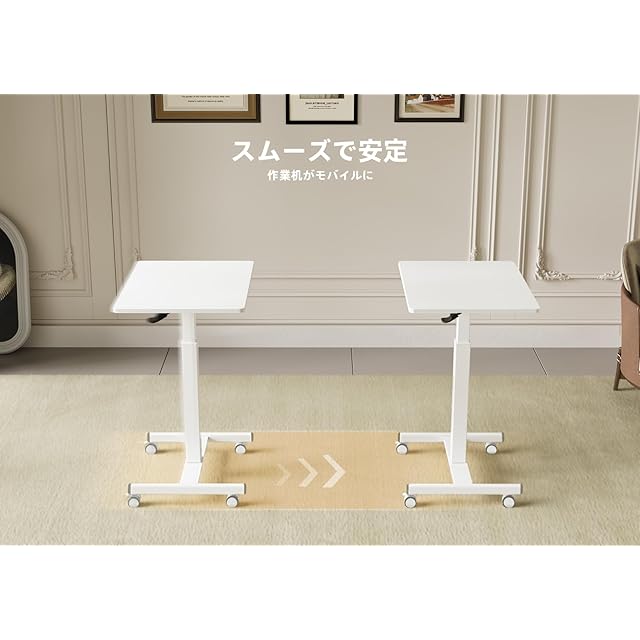 Claiks 昇降デスク ガス圧 スタンディングデスク 昇降式 テーブル 幅65cm*奥行き48cm テレワーク オフィスデスク 在宅ワーク パソコンデスク 高さ調節 キャスー付き ホワイトフレーム/ホワイト天板