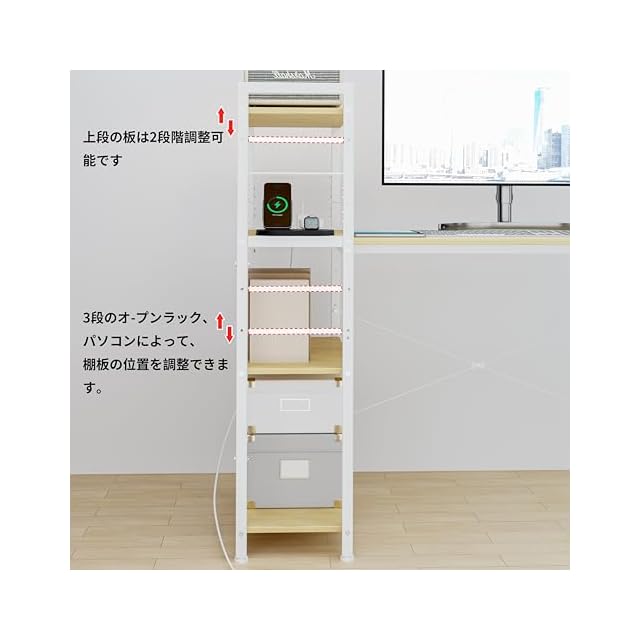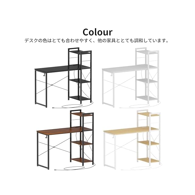 【多機能収納ラック】:4段のオープンラック、パソコンによって、棚板の位置を調整できます。 パソコンや資料を置ける広さの天板で勉強やテレワークに最適。オープンラック一体型デスクは必要なものが見やすく、すぐに取り出せて効率よくデスクワークができます。