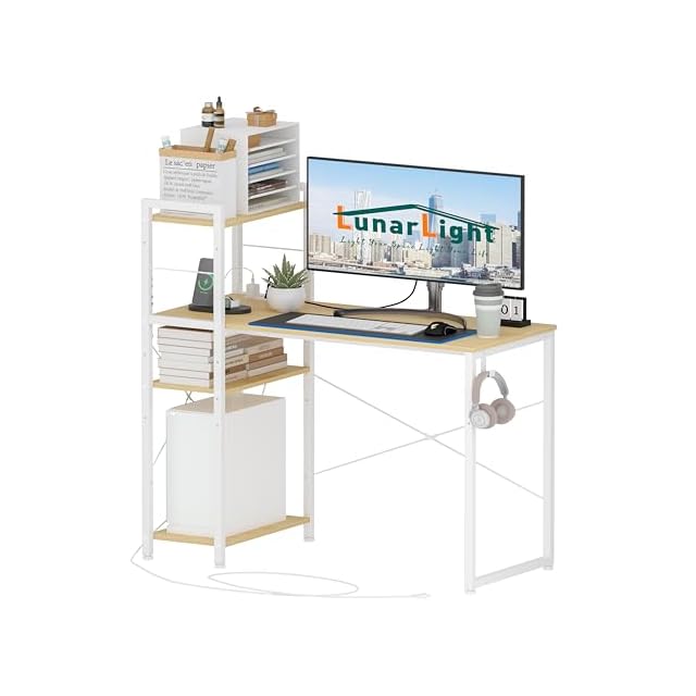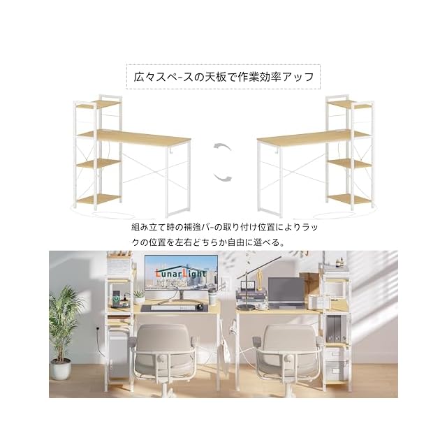 LunarLight PCパソコンデスク 机 幅110奥行48高さ110cm テレワーク 左右組み換え自由 棚板高さ調節可能 コンセント付き ラック付きデスク 110幅収納たっぷり ゲーミングデスク オフィスデスク 書斎 収納ラック付き(ナチュラル色)