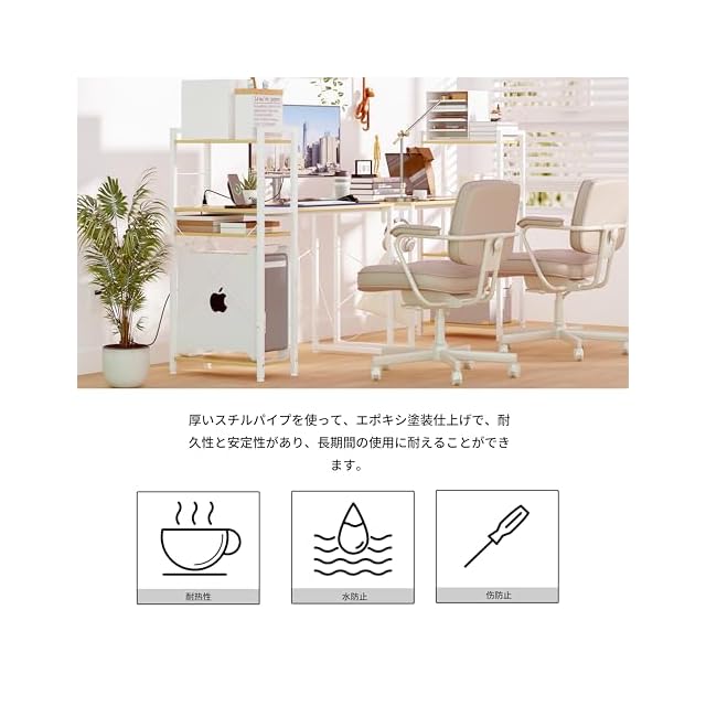 【仕様特徴】:熱・傷・汚れに強いスチールフレームを採用しています。汚れてもさっとひと拭きでお手入れが簡単です。熱の影響を受けやすいキッチンでも安心して使えます。全体に傷に強いエポキシ塗装を施しているため、質感が良く、安定感のあるパソコン台です。木製部分は樹脂を浸透させた紙を使用するので、耐久性の厚いメラミン化粧板です。耐摩耗性・防水性・耐熱性に優れています。全体荷重は80kg。