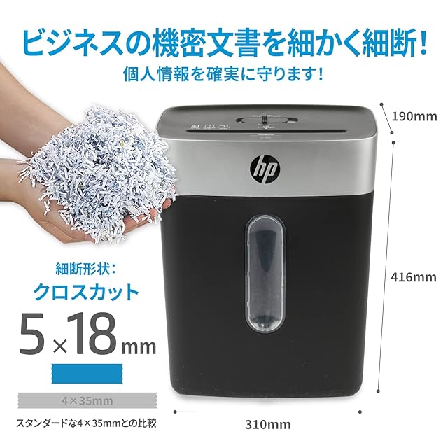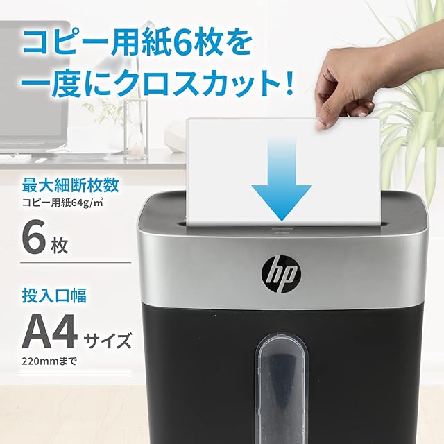HP 電動シュレッダー 家庭用(15L / 1-3人用) 静音65dB 18ヶ月メーカー保証 / 5x18mmミニクロスカット6枚同時細断(リモートワーク/在宅勤務/オフィス) 連続細断4分間 大容ダストボックス(160枚収納)/ 小型スリム/キャスター無し
