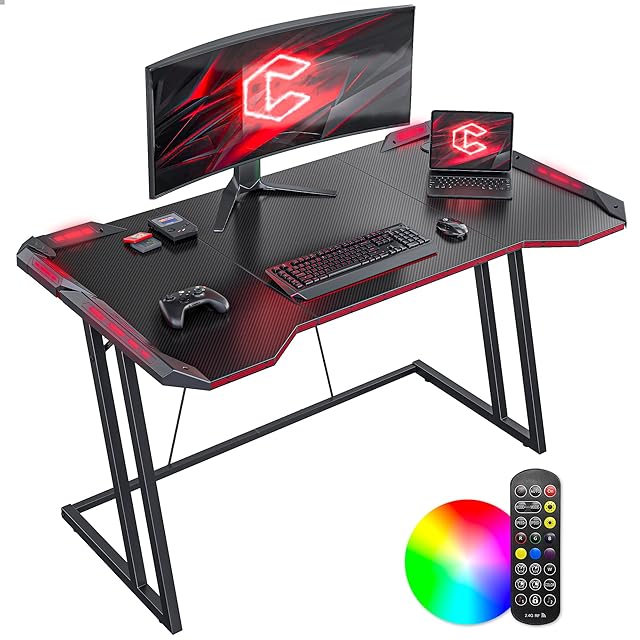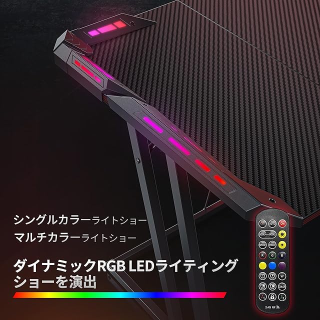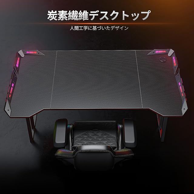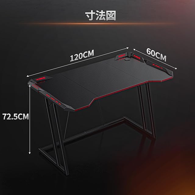 CubiCubi ゲーミングデスク 幅120cm*奥行き60cm LED付き 炭素繊維天板 組み立て簡単 頑丈 ゲーミングテーブル パソコンデスク ゲーマー向き デスク ゲーム実況安定性 おしゃれ 一人暮らし ゲームデスク ブラック