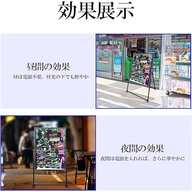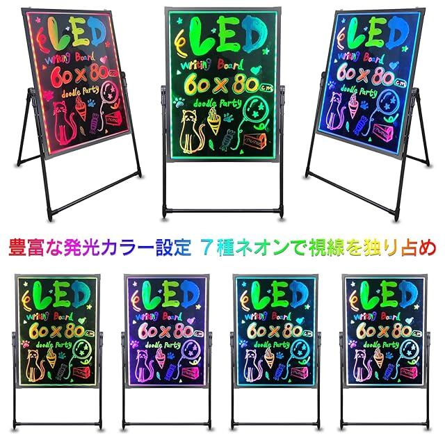 【led電子蛍光板&七色調整可能】蛍光マーカーなどでお好きな文字やイラストを描くことができます。この電子蛍光板はLED機能を搭載し、ランプは七色に調整可能で、様々な視覚効果ができ、昼も夜も綺麗な光により、行き交う人の目をひきつけます。目立つ事間違いなし。脚含む全体のサイズ:横60cm× 縦117 cm。書き込みボード部のサイズ:横60cm× 縦80 cm