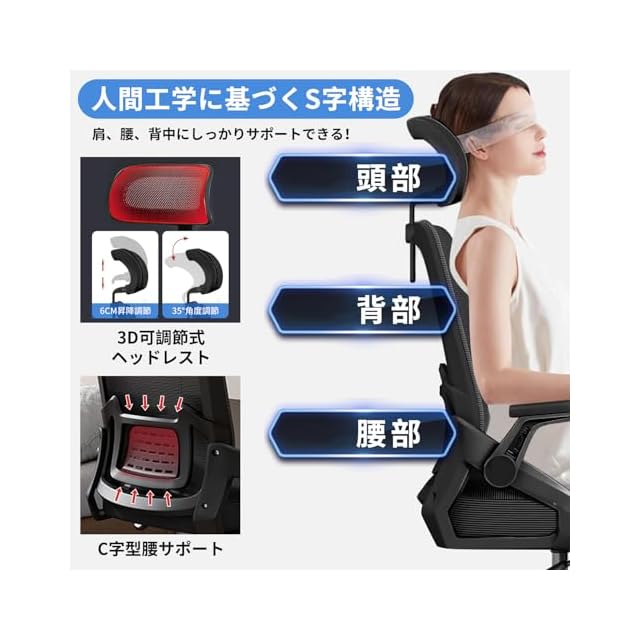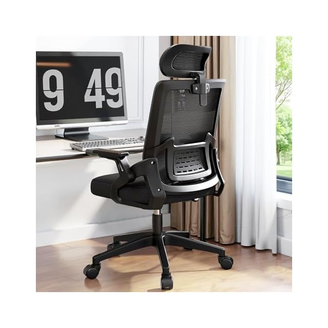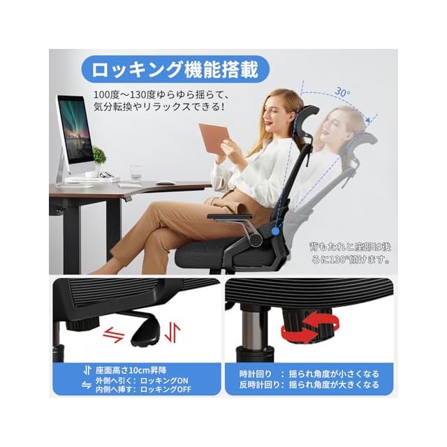 UKILIFE オフィスチェア デスクチェア 疲れない テレワークチェア ロッキング機能 人間工学 椅子 腰サポート 跳ね上げ式アームレスト 3Dヘッドレスト 高反発クッション PCチェア 通気性メッシュ ゲーミング/勉強/事務用 おしゃれ パソコンチェア (ブラック)