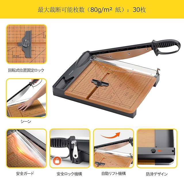 【プロフェッショナル級の切断力と耐久性】: この30cm(12インチ)の業務用断裁機は、30Cr13ステンレス鋼ブレードを採用。優れた硬度と耐腐食性を誇り、カードストック、写真用紙、クラフト材料など、一度に最大30枚まで軽々とスパッと裁断可能です (※通常使用時は刃の耐久性維持のため、20~25枚程度の裁断を推奨します)。頑丈なMDF木製ベースが切断時の安定性を確保。ご家庭、オフィス、教室での頻繁な使用にも最適です。