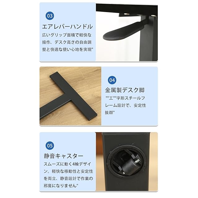 【1秒で高さ変更できる快適操作性】天板下レバーを軽く引くだけで、驚異の1秒スピード昇降を実現。ガスバネの反発力を利用した機構により、煩わしいロック解除や工具不要で、作業の流れを中断することなく高さを調整可能。スタンディングデスクとして疲れたらすぐに座って作業できるなど、ワークスタイルの変化にも柔軟に対応。効率的な姿勢チェンジで、長時間作業も疲れにくい設計です。