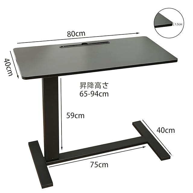 FNRPQB 昇降式サイドテーブル 机 幅80cm 高さ調節65~94cm スタンディングデスク 小さめ キャスター付き ガス圧 手動 ワンタッチ 昇降 可動式テーブル ソファー ベッド サイド テレワーク 在宅ワーク 耐荷重 40kg (ブラック)