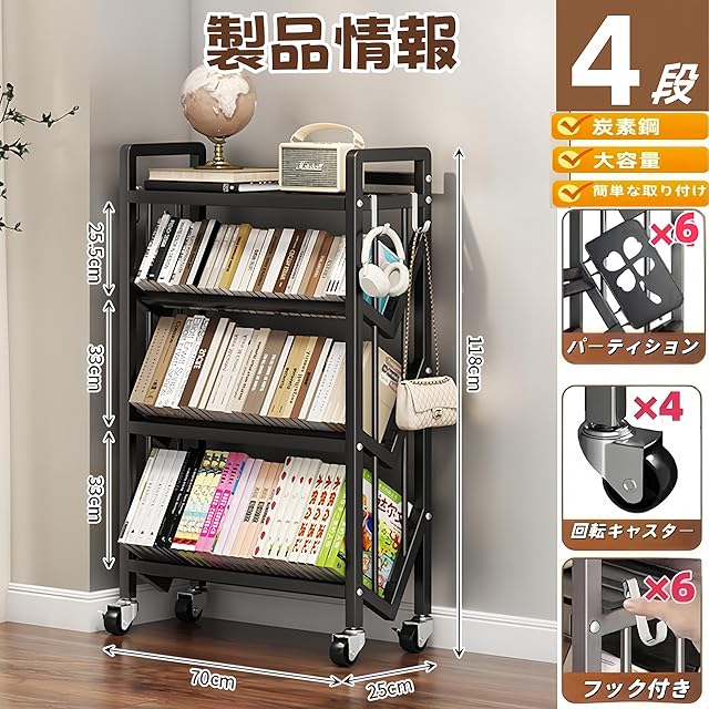 TUIYIDUO ファイルラック ファイルワゴン 本棚 4段 幅70cm×高さ118cm 回転キャスター付き 制動可能 スチール製 大容量 書類整理 教科書 漫画 雑誌 収納棚 斜め棚 出し入れしやすい 組み立てが簡単 日本語説明書付き(ブラック)