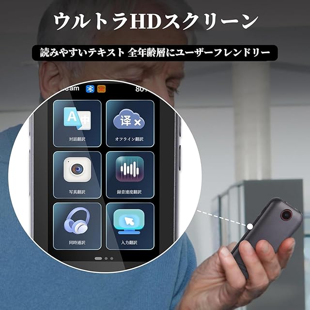持ち運びに便利なIPSスクリーンで外出先でも快適に使用可能:3.1インチの高精細IPSタッチスクリーンを採用した翻訳機は、視認性と操作性を両立。2インチの前面スピーカー設計により、騒がしい場所でも臨場感のある高音質で快適に使用できます。コンパクト設計で持ち運びやすく、旅行や出張、留学などの場面で翻訳機が大活躍。1200mAhの長時間バッテリーと省電力機能により、1日中使用しても安心。軽量かつ高性能な理想の携帯翻訳機です。