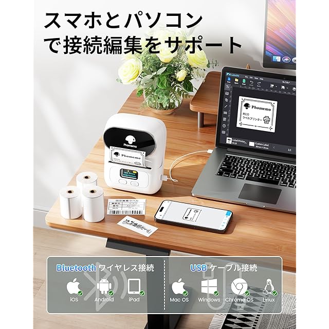 USBでPCと接続可能:感熱ラベルプリンター「Phomemo M110」は、iOS、Android搭載のスマホだけでなく、USB接続でMac OS、Windows 10にも対応し、ラベルの編集方法が多様になります。ダウンロード方法:フォメモ公式サイトへ「サポート」ー「ダウンロードセンター」より、M110を選択後、ドライバをダウンロードします。 (注:Linux、Chromebookシステムには対応していません)