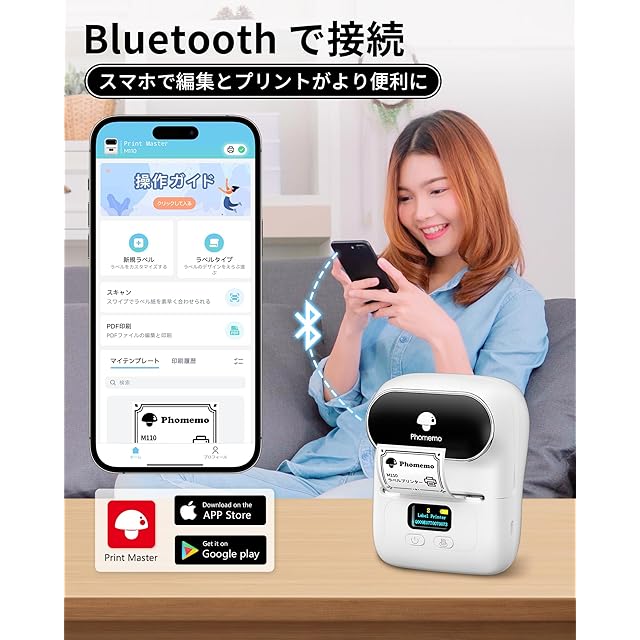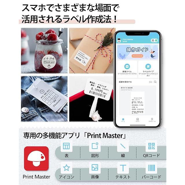 フリーな多機能アプリ:App storeやGoogle Playで「Print Master」を検索して、専用アプリをダウンロードしてください。「Print Master」アプリにはすでに20種類フレーム、36種類フォント、100種類なテンプレート、500以上種類なアイコンが用意されており、また定期的に新しい素材のをリリースする予定です。テキスト、QRコード、バーコード、アイコン、表、画像、線、時間、Excelインポートの機能で自由に作りましょう