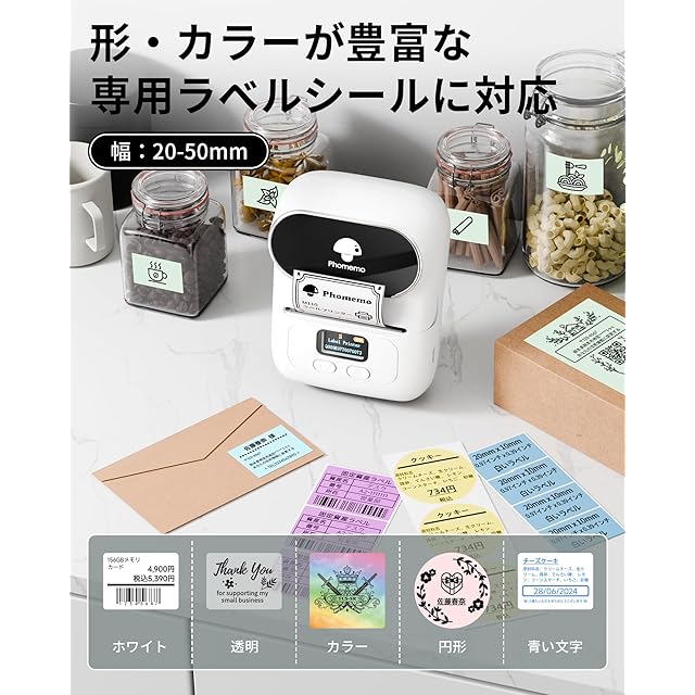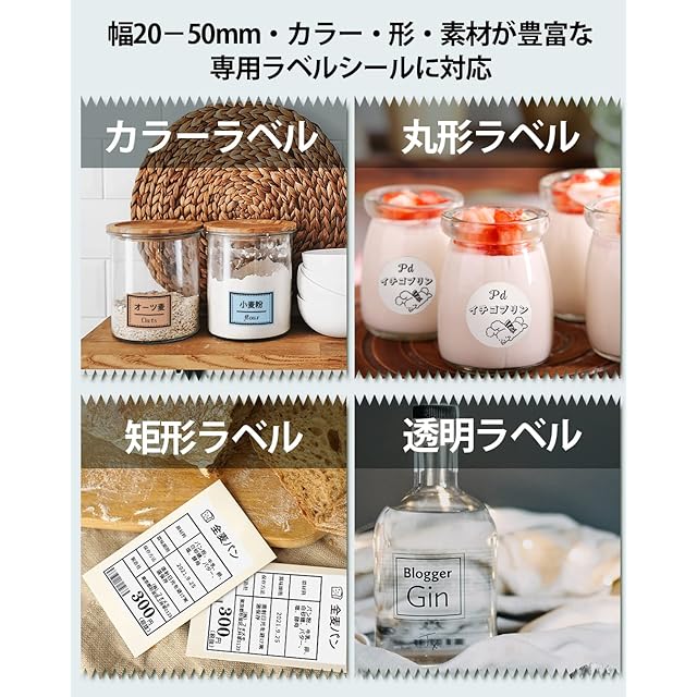 幅20 mm-50 mmラベルシールに対応:このラベルプリンターは、幅20-50 mmのダイカット形専用ラベルシールに対応いたします。そのラベルシールの表面に保護コーティングが施されており、耐水性、耐油性、 耐久性があります。アプリでセットしたラベルサイズを選択し、印刷したいテキスト、アイコン、バーコードなどを自由に入力するだけで、アプリでの効果をプレビューできます。初めての方でも手軽にラベルシールが作れるのが魅力です