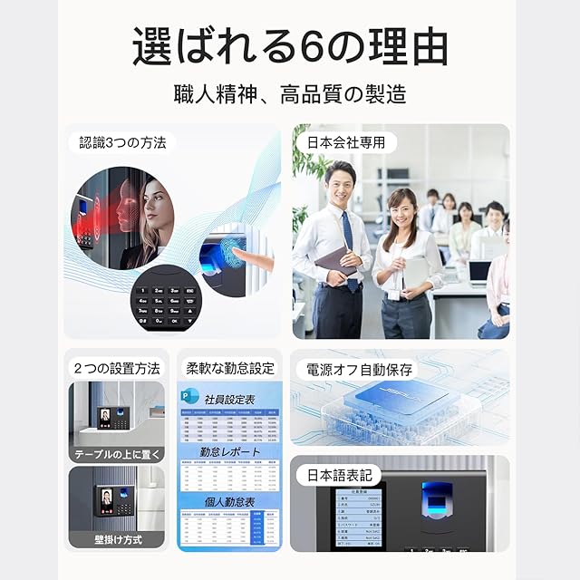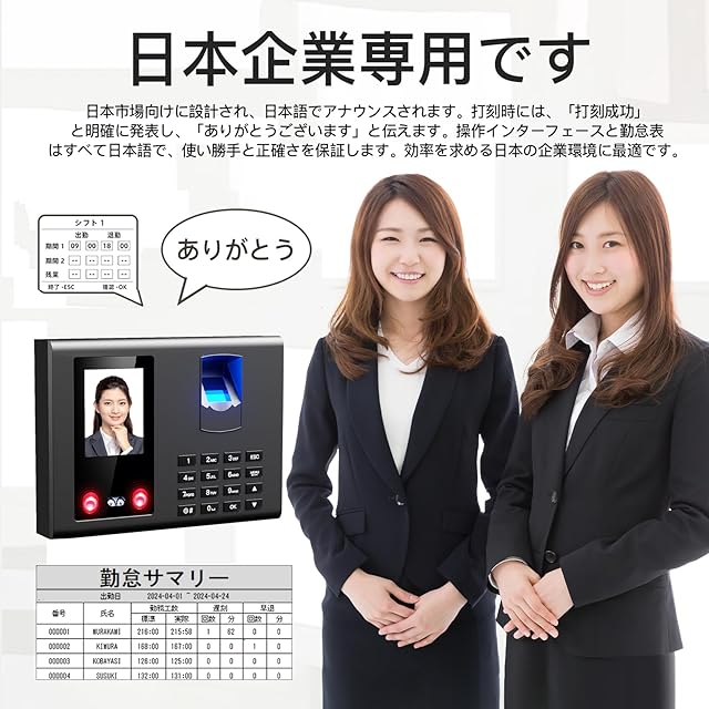 【日本企業向け・日本語音声付き】このタイムレコーダーは日本企業向けに特別に設計されており、日本語音声付きで使いやすい。会社の勤怠プロセスを簡素化し、社員の通勤時間と勤怠データを自動的に記録し、手動の記録と検証の時間コストを削減し、作業効率を向上させます。勤怠データを通じて記録および分析することで、社員の働き方とリソースの利用状況をよりよく理解できるようになり、リソース配分の最適化とコスト削減につなげることができます。