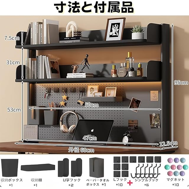 【組み立て簡単】日本語説明書付き 、この収納ラックはデザインがシンプルで、設置が容易で、複雑な工具やスキルは必要ありません。初心者でも、数分で設置が完了します。 注:この棚にはLEDライトは含まれていません