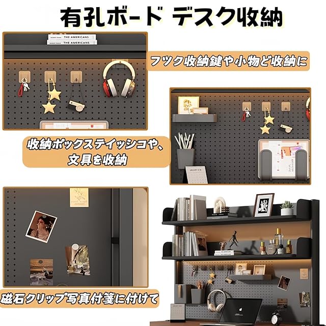 【有孔ボード設計】この机上ラックの大きな特徴は、有孔ボード設計を採用していることです。L字フック、ペンスタンド、ミニコンテナ、マグネットクリップ 、自由に有孔ボードに取り付け出来、何回も変更することができます。