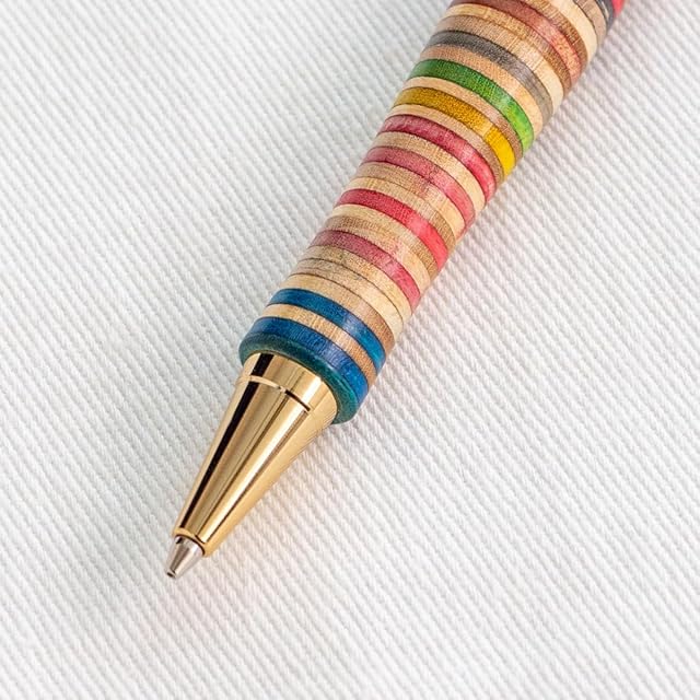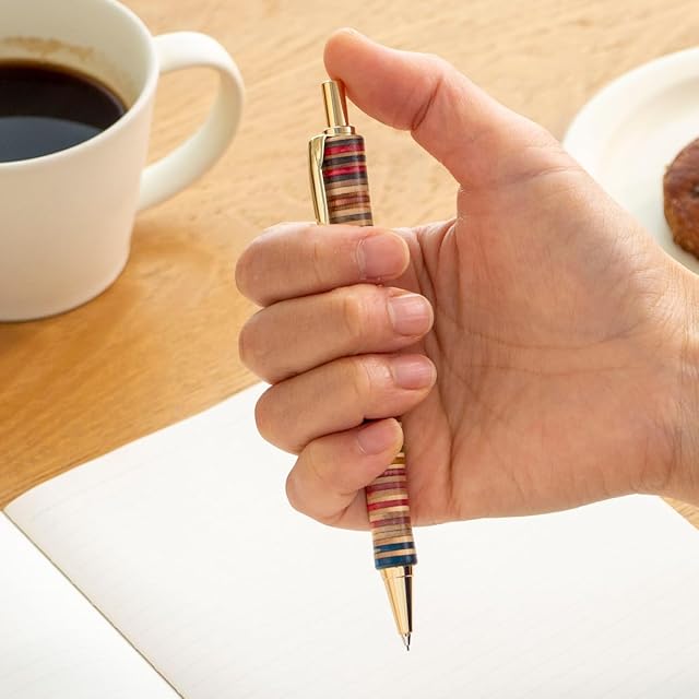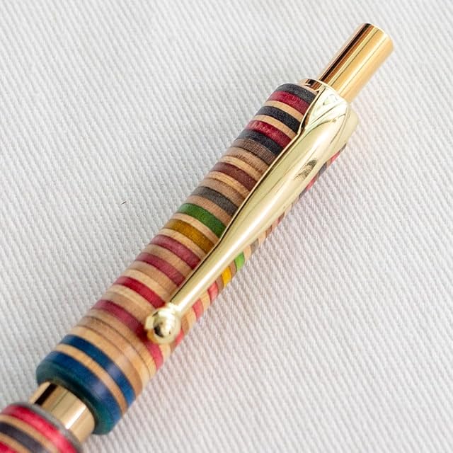 廃材となったスケートボードの板を材料とした木製のシャーペンです。5枚のアンティークスケートボードを圧縮しマルチカラーのペンに仕上げました。