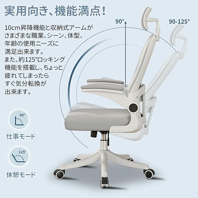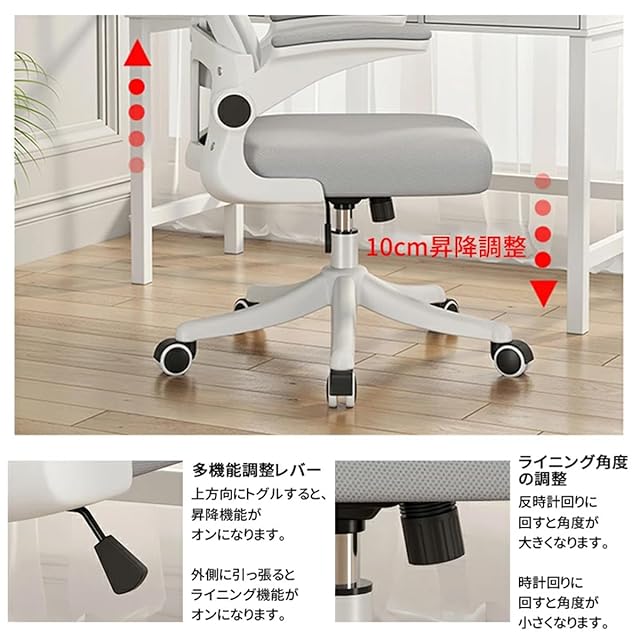 ✅【豊かな機能性】10cmの昇降機能と収納式アームを採用。カンタン昇降で使う人に合わせて、最適な高さが調整可能。座面が揺れるロッキング機能を、背伸びしてリフレッシュ!